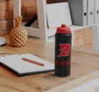 Červenočerná plastová láhev na vodu s logem BK KVIS Pardubice.